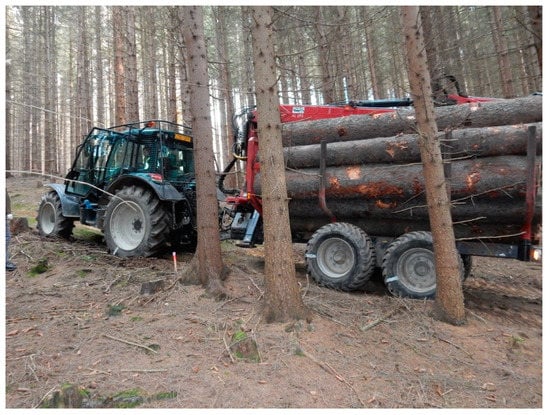 The operating parameters of the hybrid drive of the trailer were tested during the autumn of 2019 in forest stands (spruce monoculture) near the village of Nová Říše (49.1394083 N, 15.5635939 E) in the Czech Republic (Figure 4). The test track was located on an unpaved dirt road—a skidding lane with an average track gradient of 10.7°. The air temperature during the measurements ranged from 12 to 15 °C. The gear engaged in the tractor for driving on the test track was A1, and the tractor engine speed was 1800 RPM.