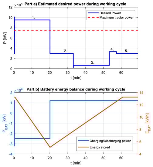 (a) Course of the power required during the demanding working cycle—the loaded tractor−trailer unit (potentiometer setting at 50%) travels uphill (gradient 15°) over an unpaved surface. (b) Charging/discharging battery power and energy balance during the described working cycle. The parts of working cycle are numbered according to Table 1 and Table 2 (author: Ivo Pazdera).