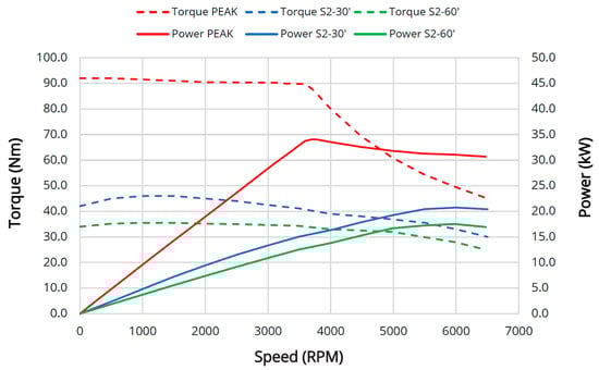 Measured loading characteristics of the drive. Depicted curves are shown for three cases: PEAK—short-term motor loading, ca. tens of seconds; S2-30′—motor loading for a maximum of 30 min; S2-60′—motor loading for a maximum of 60 min (author: Petr Procházka).