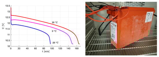 Figure 7 presents the courses of the discharge characteristics of the SBSC11F cell at temperatures of 20 °C, 0 °C and −20 °C. It was also necessary to verify how great the decrease in the battery capacity was with temperature decrease, in comparison to the state at the nominal temperature of 20 °C. Therefore, the battery was firstly measured in a refrigerator (BINDER MK 240) before it was built into the forwarder. Before each test, the battery was charged at 20 °C to a voltage of 13,4 V at standstill. Tests at different temperatures were conducted repeatedly, with a relaxation time of at least 12 h at 20 °C between each charging and discharging. The measurements showed a significant decrease in the capacity dependent on the surrounding temperature. At a temperature of 0 °C, the capacity dropped to 90% of its nominal value, and at a temperature of −20 °C, it fell to 60%. In spite of this distinct decrease in the capacity, it can be assumed that the selected battery is be sufficient for powering the tractor-trailer unit in the chosen loading cycle at a usual temperature of ca. −10 °C.