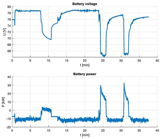 The installation of an electric drive in the tractor-trailer unit was followed by field tests. The obtained data from the tests confirmed that the estimates of the required power were in line with the maximum values measured during real operation. The courses of the battery power and voltage are shown in Figure 8. The maximum peak power taken from the battery reached ca. 33 kW, with the drive being able to supply a peak power of up to 72 kW for a time of 10 s, and permanently up to ca. 50 kW. Nevertheless, with respect to the battery stress, the power consumption should not exceed ca. 35 kW. The course of the voltage showed that the battery voltage depended on the consumed current. Even at the highest load, there was a sufficient voltage in the battery and, hence, in the DC link of DC/AC converter, which can maintain the required revolutions of the electric motor and, thus, of the hydraulic pump.