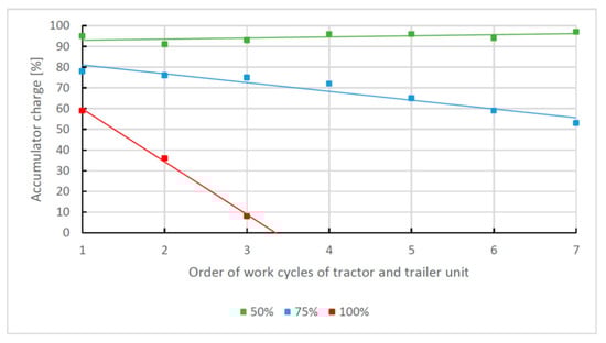 At the end of each working cycle of the tractor-trailer unit, the level of battery charge was determined as the percentage of its total capacity.