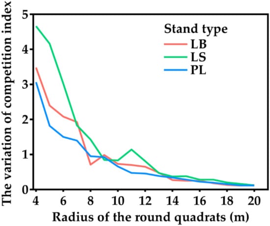 As shown in Figure 1, with the increase in the distance between competing trees, the change in the average CI of trees within the radius of 8 m decreased rapidly, while outside the radius of 8 m, the change in the CI was stable, indicating that competing trees outside the radius of 8 m had little influence on the target trees. Therefore, 8 m was identified as the competitive radius in this study.