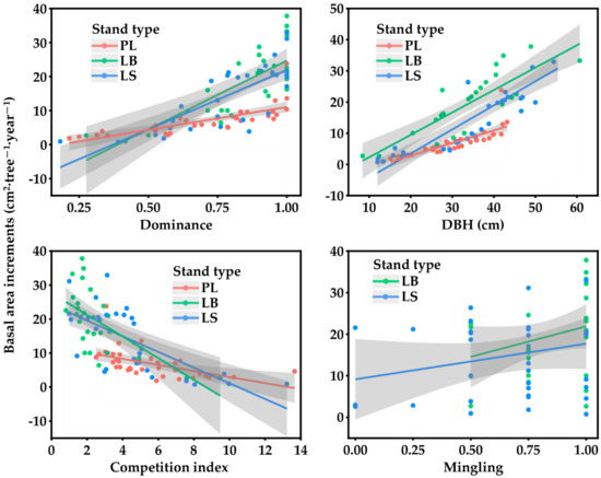 Individual basal area increments in different larch stand types varied with dominance, DBH, competition index, and mingling. Grey areas represent 95% confidence interval for each stand type.