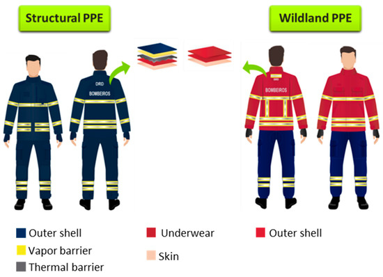 According to Portuguese firefighters’ legislation (dispatch 7316/2016) and accomplishing the respective standards, Figure 1 presents the current personal protective clothing for structural and wildland firefighting.