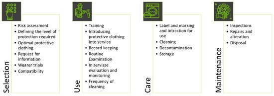 PCMs’ integration into firefighters’ protective clothing have considered the guidelines present in CEN/TR17620:2021. This technical report defines guidelines regarding the selection, use of care, and maintenance of smart garments protecting against heat and flames. Figure 2 shows the main topics within each step of the PPE life cycle.