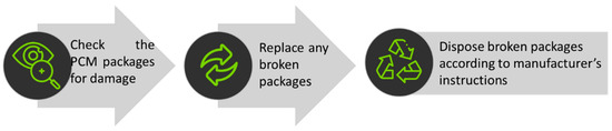 Concerning the inspection of PCM packages on a regular basis, the user must inspect the packages according to the outline in Figure 3 and at least once a year verify whether the PCM will melt at their melting point. The disposal of broken packages must be conducted according to the manufacturer’s instructions.
