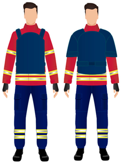 Considering that recent studies determined that the optimum position of the PCM layer was closest to the external heat, PCM packages are being integrated into a vest to be worn over a conventional firefighters’ PPE, creating a smart protective clothing system. The design of the vest was studied to protect mainly the torso of the firefighter, preserving ergonomics. However, after some feedback from firefighters, a second version was developed to enhance the protection of the upper limbs (Figure 4).