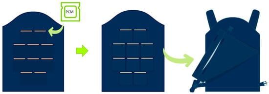As evidenced in Figure 5, PCM packages were integrated in a matrix composed of two layers: an insulation material and a flame-retardant fabric. The introduction of the PCM packages through laser cut openings makes routine inspections and cleaning procedures described in the SUCAM easy and allows for the replacement of broken packages. Afterwards, this matrix was inserted into the vest’s main structure, creating a PCM vest. In addition to making SUCAM procedure’s easier, the design of the vest also considered circular economy principles, since this removable system allows for the separation of all the components of the vest, making it possible to recycle them.