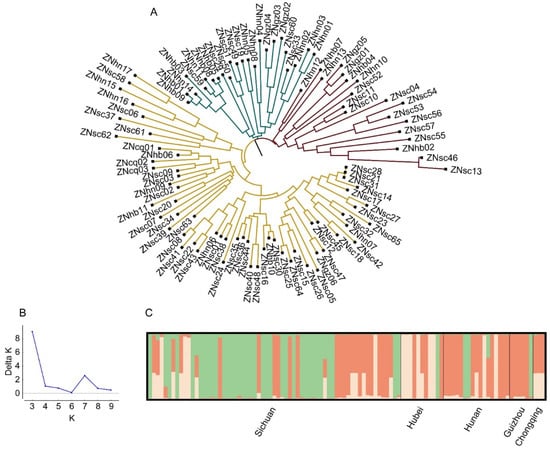 - Pritchard, J.K.; Stephens, M.; Donnelly, P. Inference of population structure using multilocus genotype data. Genetics 2000, 155, 945–959. [Google Scholar] [CrossRef] [PubMed]