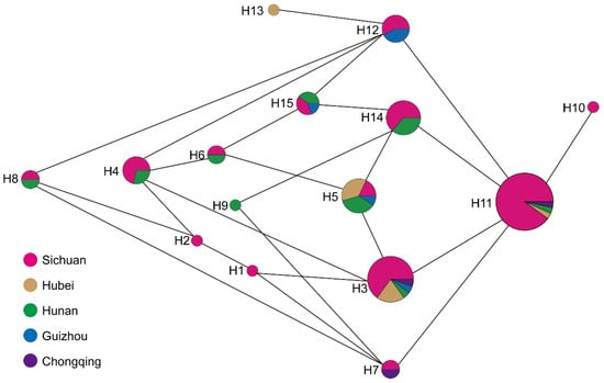 - Bandelt, H.J.; Forster, P.; Röhl, A. Median-joining networks for inferring intraspecific phylogenies. Mol. Biol. Evol. 1999, 16, 37–48. [Google Scholar] [CrossRef]
