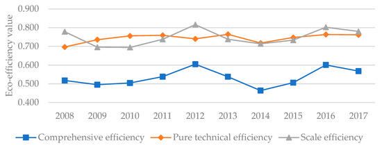 In order to further explore the overall change characteristics of the eco-efficiency of Chinese tourism, this study decomposed the eco-efficiency of tourism, that is, the comprehensive efficiency, into pure technical efficiency and scale efficiency. The results are displayed in Figure 1.