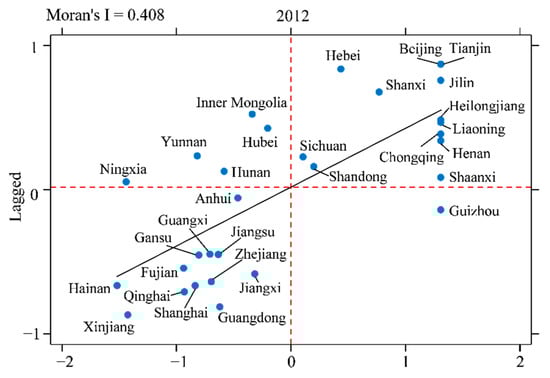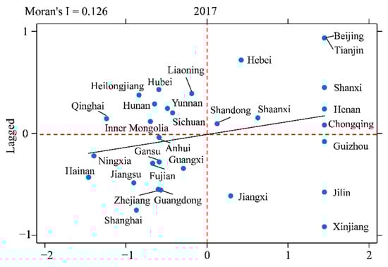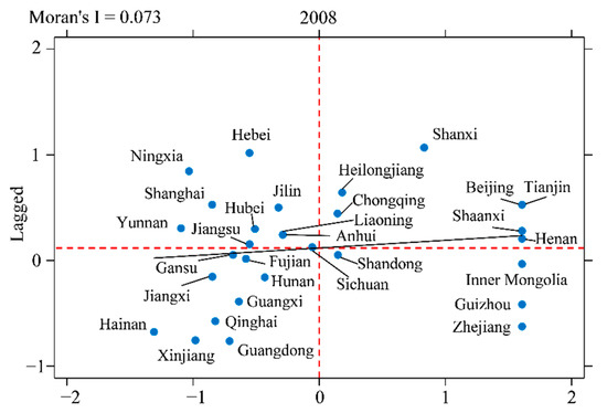 To further study the spatial autocorrelation pattern of the eco-efficiency of provincial tourism in China, data from 2008, 2012 and 2017 were selected as cross-sectional data to calculate the Local Moran’s I of each province. The results are shown in Figure 2, Figure 3 and Figure 4. In the figures, the horizontal axis represents the standardized the regional eco-efficiency of tourism in each region and the vertical axis represents the eco-efficiency of tourism in each region by weighting spatially weighted matrixes. Moreover, the first, second, third and fourth quadrants of these figures separately represent the high-high (HH) cluster, low-high (LH) outlier, low-low (LL) cluster and high-low (HL) outlier. The HH cluster means that regions with a high eco-efficiency of tourism are surrounded by regions also with a high eco-efficiency, and others are defined following the same principle.