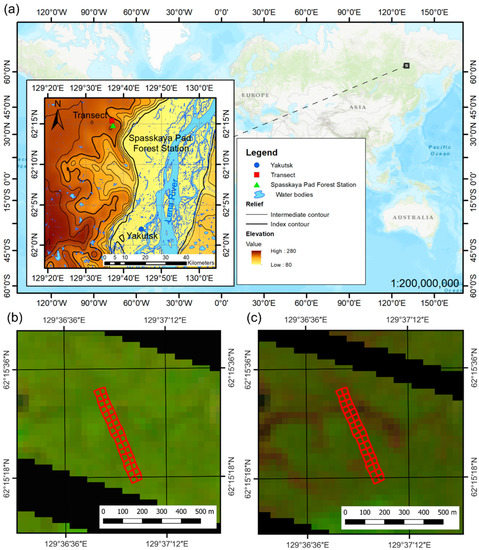 Location of the Spasskaya Pad Station (62°25′ N, 129°62′ E) and the study transect near Yakutsk in the topographical map zoomed from a global map (a). The study transects 60 m × 510 m in Landsat 7 ETM+ Natural Color Images with a spatial resolution of 30 m before the wet event on 11 June 2006 (b) and after the wet event on 9 June 2008 (c). The red polygons represent the 34 plots. The black stripes in the last two figures represent the Landsat 7 scan-line error (no data).