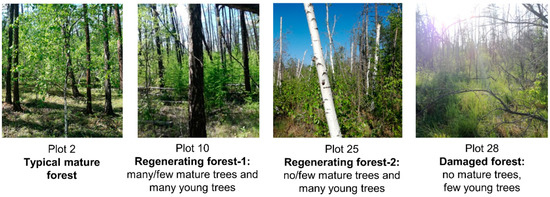 Figure 1b,c shows the vegetation cover (Landsat 7 ETM+ Natural Color Images) 1 km north of the Spasskaya Pad Forest Station before (2006) and after (2008) the extreme wet event, respectively. In order to investigate the long-term effect of the extreme wet event on the forest, in the summer of 2018 (a decade after the event), a 60 m × 510 m transect was set up using wooden pegs and plastic strings, in both intact and affected areas. The transect was divided into 30 m × 30 m plots (in total, 34 plots, red polygons in Figure 1b,c) and these were visually classified based on the forest conditions from the photographs. Four forest types were distinguished along the transect, as shown in Figure 2: typical mature forest (TF; number of plots in the transect, n = 17), regenerating-1 forest (RF-1: many/few mature trees and many young trees; n = 11), regenerating-2 forest (RF-2: few/no mature trees and many young trees; n = 4), and damaged forest (DF: no mature trees, few young trees; n = 2). The first plots discerned as TF, consisted of mature larches, approximately 180 years old with a height of approximately 22 m [49] and these had no visible damage from the wet event. The stand density of the larch trees in the TF measured in August 2018 was 1280 trees ha−1 [50]. The plots discerned as regenerating forest RF-1, had many dead mature larches that formed forest gaps in the overstory where there were a large number of young larches (seedlings and saplings with a height of up to 3 m) and shrubs. In the years following the wet event, larch seeds germinated and formed a large number of young trees in the RF-1. The damaged forest DF, where all mature trees died, was covered predominantly by moisture-tolerant grasses, and there were much smaller numbers of young larches than in the RF-1. The DF plots were located on the depression in a trough and mound topography (shown by a dark-brown color in Figure 1c) and some patches of the DF plots were flooded. The regenerating forest RF-2 plots had a moderate forest condition between the RF-1 and DF. The geographical coordinates (longitude and latitude) of the pegs defining the boundaries of each plot were measured using a handheld GPS (Garmin) with a horizontal accuracy of 3 m in order to estimate the satellite-derived NDVI for the plots.