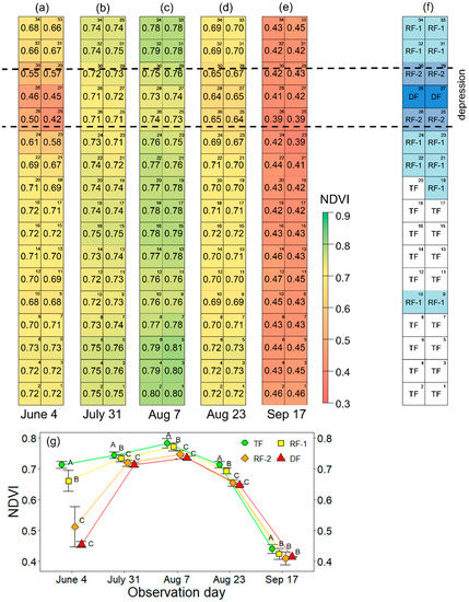 Spatial variations in the NDVI along the transect calculated based on the Landsat 8 images captured in the summer of 2018: (a) on 4 June; (b) on 31 July; (c) on 7 August; (d) on 23 August; (e) and on 17 September. Variations are presented as the heat maps with the color scale bar. The central number shows an average value of the NDVI within the plot. Serial numbers of the plots are shown at the top right corners. (f) Scheme of the distribution of the four larch forest types on damage levels observed along the transect: typical forest (TF), two types of regenerating forest (RF-1 and RF-2), and damaged forest (DF). The transect plot numbers are shown at the top right corners of the plots. The black dash lines display the conditional borders of the depression in the transect (plots from No. 25 to 30). (g) Seasonal variations in the NDVI of the forest types. Different upper-case letters (A, B, C) mean the statistical significance in the comparison among forest types on an observation day.
