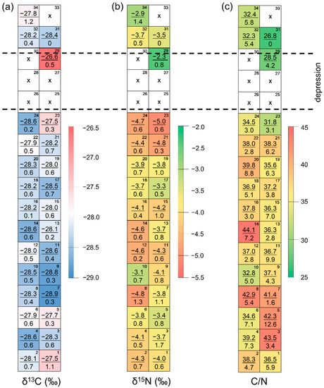Spatial variations in (a) the foliar δ13C (‰), (b) the foliar δ15N (‰), and (c) the foliar C/N ratio averaged in each plot (average and standard deviation values are shown as numerator and denominator, respectively). Variations are presented as the heat maps with color scale bars. Serial numbers of the plots are shown at the top right corners. Number of samples from the plots was n = 1 for the RF-1 plot No. 31, n = 2 for the RF-1 plots No. 23 and 24, n = 4 for all other plots (results from No. 25 to 28, 30, and 33 are not shown because mature trees were not available). Black dash lines display the conditional borders of the depression in the transect (plots from No. 25 to 30).