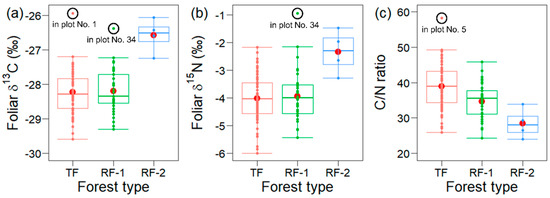 Box plots of the (a) δ13C (‰), (b) δ15N (‰), and (c) C/N ratio of each tree sample from the TF (n = 68), RF-1 (n = 33), and RF-2 (n = 4). Box encompasses the 25th through 75th percentiles (inter-quartile range IQR) with the median 50%. Lower (higher) whisker corresponds to the smallest (largest) observation within 1.5 times IQR below the lower quartile (above the upper quartile). Boxplot outliers are circled with the plot number. Red dot in a box indicates mean value of all samples from a forest type.