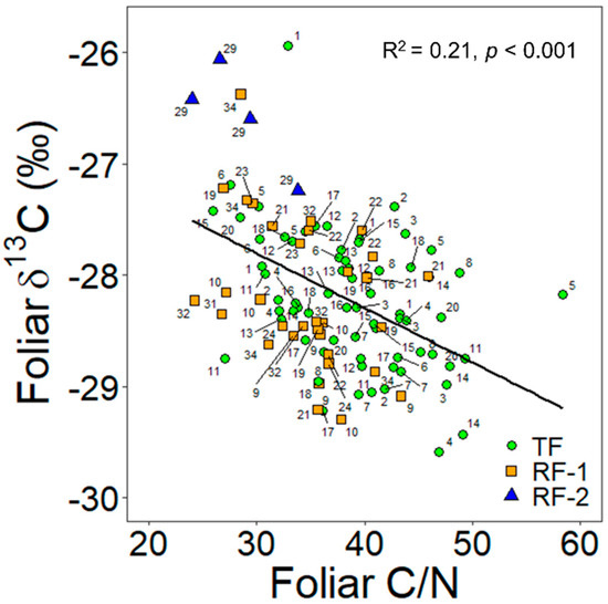 Relationships between the foliar δ13C and C/N for each tree sample from the TF (n = 68), the RF-1 (n = 33), and the RF-2 (n = 4). Each sample was labeled with a plot number. Black solid line shows the linear regression line for all samples in the transect.