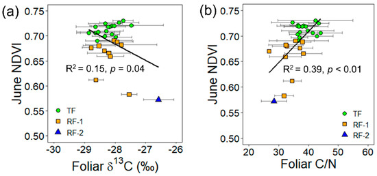 Relationships between the NDVI on 4 June 2018, the δ13C (a) and the C/N (b) at each plot for the TF (n = 17), the RF-1 (n = 10), and the RF-2 (n = 1). Horizontal error bars represent standard deviations. Black solid line shows the linear regression line for all plots in the transect.