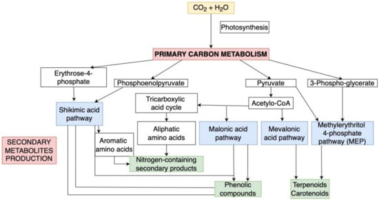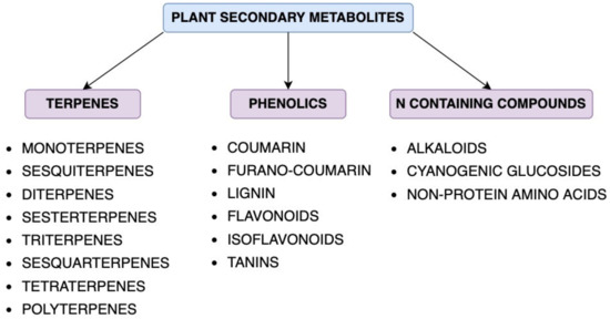 Secondary metabolites are classified into three main groups (Figure 2) [1]: terpenoids, phenolic compounds, and non-protein nitrogen compounds such as alkaloids [4].