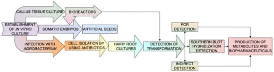 A team from the Federal University of São Carlos (2019) developed three key techniques for the production of herb and conventional drugs in vitro that differ in processing of the initial plant material. The first technique relies on the multiphase propagation of plant material in vitro, especially the production of large numbers of highly productive seedlings. The main disadvantage of this approach is its low time-effectiveness; a great deal of time is necessary from initiation of cultures to effective production of target metabolites. The second method relies on the application of a variety of biotic and abiotic treatments, that is, elicitors, in order to stimulate metabolite production in the initial biomass. The last of the methods mentioned above involves genetic modification of the plant species to serve as bioreactors for the production of the desired secondary metabolites. This approach aims to improve the levels of metabolite production in specific plant tissues. The advantage of the latter two methods over the first one is their fast applicability [39]. Another frequently used in vitro method useful in production of secondary metabolites are plant cell cultures. This approach benefits mostly from its simplicity, reliability, and predictability of the underlying processes [40]. Another method used to produce secondary metabolites is hairy root cultures. This method relies on genetic transformation using RI plasmid (root-inducing plasmid), naturally occurring in Agrobacterium rhizogenes bacteria [41]. Despite its undoubtful advantages, the method is relatively inefficient, as well as biosynthetically and genetically unstable in the long term cultures [37,42,43,44,45].