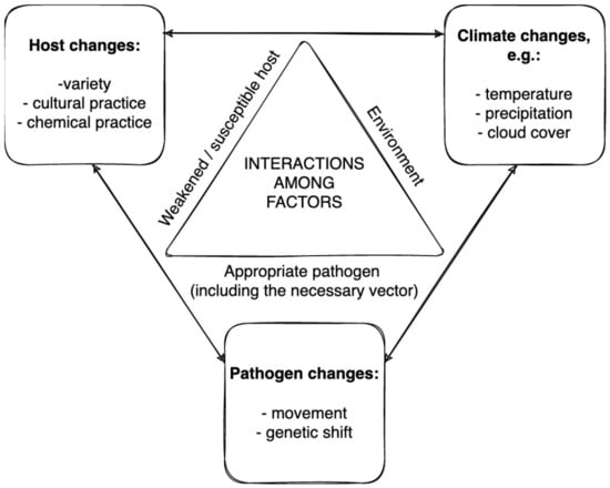 The occurrence of plant diseases depends on three main stimuli: a favorable environment, a susceptible host, and the presence of the correct pathogen (often with an insect vector) [92,96]. A host that can defend itself against unfavorable conditions will be more resistant to local pathogen genotypes, thus reducing the intensity of the disease (Figure 5) [92].