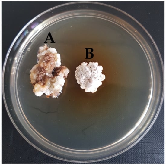 Interaction in in vitro dual culture between Fraxinus excelsior callus (A) and endophyte Thielavia basicola (B). The fungus did not kill the F. excelsior callus after 60 days of culturing without passaging. The mycelium of T. basicola developed a distinctive white coating that made the entry of hyphae into the tissues of the callus impossible. It is probable that the growth of mycelium was inhibited by the callus tissue producing secondary metabolites. During culturing the tree tissue remained fully viable and optimally hydrated. The endophyte also caused a yellow staining of the MS medium [52].
