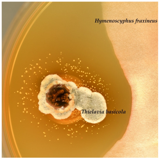 Interaction in in vitro dual culture between Hymenoscyphus fraxineus (pathogen) and Thielavia basicola (endophyte). Macroscopic observations of the interaction between H. fraxineus and T. basicola show a strong inhibitory effect of the endophyte on the growth of the pathogen. In dual cultures, the endophyte produced an unidentified secondary metabolite secreted into the medium, visible in the form of dark beige crystal-like structures [52].