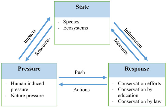 The PSR (Figure 1) presents the linkages between the pressures exerted on biodiversity conservation caused by human activities (pressure box), the change in quality and quantity of biodiversity (state box), and the response to these changes as society tries to reduce the pressure and conserve the biodiversity resources (response box). The interchanges among these boxes form a continuous feedback mechanism that can be monitored and used for the assessment of biodiversity resources. Therefore, the factor “Pressure” describes developments in physical and biological agents, the use of resources, and the use of land. The pressures exerted by society are transported and transformed into a variety of natural processes to manifest themselves in changes in environmental conditions. The factor “State” describes the quantity and quality of physical, biological, and chemical phenomena in a particular area, while the factor “Response” refers to responses by groups and individuals in society and government attempts to prevent, compensate, ameliorate, or adapt to changes in the state of the environment [26].