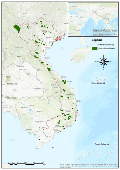 Map of Vietnam and the distribution of special-use forests for biodiversity conservation (Source: Modified from MARS and ESRI).