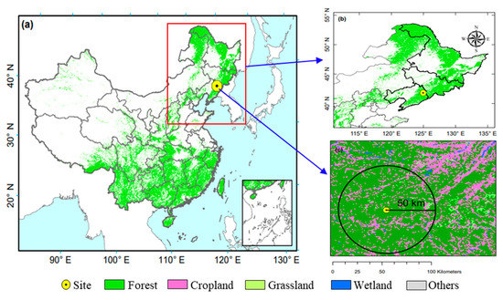 Location of Qingyuan Forest station in Northeast China. (a,b) present the location of Qingyuan Forest station in the map of China; (c) presents the main land use types within a 50-km radius of Qingyuan Forest station.