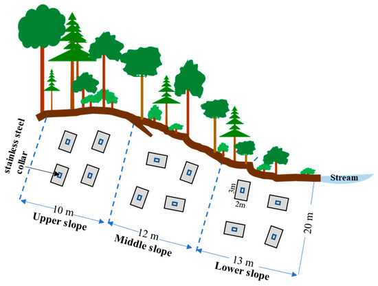 To determine in situ soil N2 and N2O emissions, static chamber and 15N gas flux methods were adopted for rate measurements. In June 2015, one transect zone (site 1) along a 20 m (width) × 35 m (length) slope was chosen and divided into lower (20 m × 13 m), middle (20 m × 12 m), and upper (20 m × 10 m) slopes with three distinctive soil moisture conditions: high, intermediate, and low, respectively (Figure 2 and Figure S1). At each slope zone, four 2 m × 3 m plots were randomly established, and a collar of stainless steel (basal area 0.09 m2, 30 cm × 30 cm) was randomly anchored into the soil at 10 cm depth in each plot (Figure 2). All collars were finished one week before soil 15N labeling. The collar had a square groove of 3 cm × 3 cm depth for matching the stainless steel chambers, and the square groove could provide a gas-tight seal when filled with water. The chambers were equipped with a 3-way sampling port and a 3 mm diameter pressure equilibration tube (15 cm long) on the preinstalled frames. Solutions of labeled Na15NO3 (99.26 atom% 15N, Shanghai Research Institute of Chemical Industry, Shanghai, China) were evenly injected into the soil within the collars at a rate of 2.5 g 15N m−2 (diluted in 900 mL DI water, through 144 injections) by a syringe with a 10 cm long needle. The area inside the collar was then sprinkled with 300 mL DI water to wash the residual labeled solution on the litter into the soil. Subsequently, the collars were covered with the chambers, and a 50 mL gas sample was taken from the headspace with a gas-tight syringe at the time points of 4, 7, 24 and 30 h after the 15N tracer injection. The gas samples (50 mL) were transferred into the Tedlar gas bags (100 mL). At the end of incubation, five soil cores (0–20 cm) in each chamber were collected with a stainless steel sampler (2.5 cm diameter, 50 cm length) and composited to one sample. Field ambient air samples and composite soil samples (0–20 cm) were taken at the beginning of the incubations near each collar (within 15 cm distance).