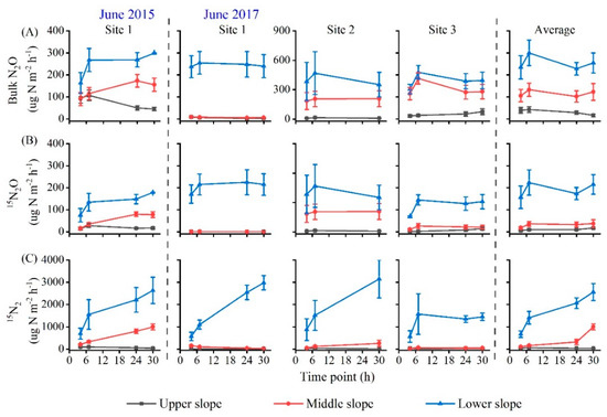 Similar to 15N2O, the 15N2 emissions with incubation time at each slope position also had different patterns among sites (Figure 3C). The average 15N2 emissions at the lower and middle slopes significantly increased with incubation time, while a slight downward trend was observed at the upper slope (Figure 3C). Furthermore, the N2 flux produced from denitrifying NO3− pool (N2denitrification) varied from 4 to 4517 μg N m−2 h−1 among sites, being much higher than N2O emissions (Figure 4). A large variation in denitrification rate (N2 + N2O) was also observed among sites (Figure S3A). Overall, the mean fluxes of N2denitrification and total N2, as well as denitrification rates, significantly decreased from the lower to the upper slope (Table 2, Figure 4C and Figure S3A).