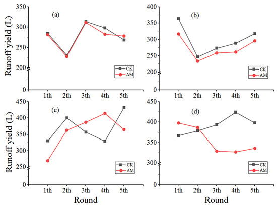 Variation in runoff yield in different soil troughs under simulated scouring in (a) Cynodon dactylon, (b) Lotus corniculatus, (c) Zoysia japonica, and (d) Astragalus sinicus.
