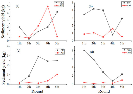 Variation in sediment yield in different soil troughs under simulated scouring in (a) Cynodon dactylon, (b) Lotus corniculatus, (c) Zoysia japonica, and (d) Astragalus sinicus.