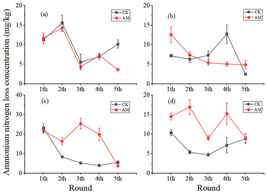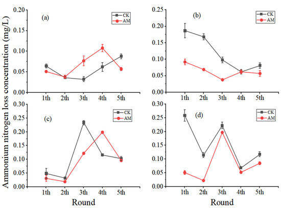 Nitrogen is one of the most demanded nutrient elements during plant growth, and nitrogen is the main limiting factor for the primary productivity of terrestrial ecosystems [34]. Nitrogen is a key limiting nutrient element in many ecosystems; plants mainly obtain nitrogen in the soil through inorganic forms. Among them, NH4+ and NO3− are the two basic inorganic nitrogen sources that are most easily absorbed and utilized by plants in soil. Nitrogen exists mostly in organic form, and the uptake of organic nitrogen by plants relies on microorganisms to break it down into inorganic forms [35]. In this study, the runoff ammonium nitrogen loss concentration of the four grass strips showed a trend of AM treatment less than CK treatment under continuous scouring (Figure 3), which may be because AM fungi promoted the growth of grass roots and enhanced soil stabilization. Therefore, it can effectively maintain soil and water and reduce the risk of nitrogen loss caused by soil erosion. The ammonium nitrogen loss concentration of sediment in the four grass strips showed a decreasing trend under continuous scouring (Figure 4). Under AM treatment, C. dactylon and L. corniculatus showed a decreasing trend in sediment ammonium nitrogen loss concentration compared with CK treatment. The results indicated that AM fungi had a better effect on the root systems of C. dactylon and L. corniculatus to hold water and soil.
