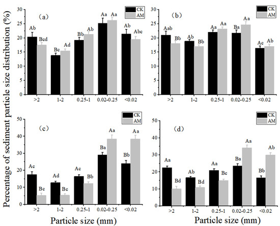 In the four grass strips, the percentage of sediment particle size at >2 mm was significantly higher under CK treatment than under AM treatment (p < 0.05; Figure 5). Except for C. dactylon, the percentage of sediment particle size in other grass strips in the range of 1–2 mm was significantly higher in CK treatment than in AM treatment (p < 0.05). In Z. japonica and A. sinicus under AM treatment, the percentage of sediment particle size in the >2, 1–2, and 0.25–1 mm categories was significantly lower than that of CK treatment (p < 0.05), whereas the percentage of sediment particles in the 0.02–0.25 and <0.02 mm categories was significantly larger than that of CK treatment (p < 0.05). Except for C. dactylon, the percentage of sediment particle size of other grass strips in the range of 0.02–0.25 mm was significantly lower in CK treatment than in AM treatment (p < 0.05). In the four grass strips, the percentage of sediment particle size at 1–2 mm was significantly smaller than that of sizes 0.25–1 mm and 0.02–0.25 mm. In Z. japonica, the percentage of sediment particle size at 0.02–0.25 mm and <0.02 mm was significantly higher than that of other particle sizes (p < 0.05).