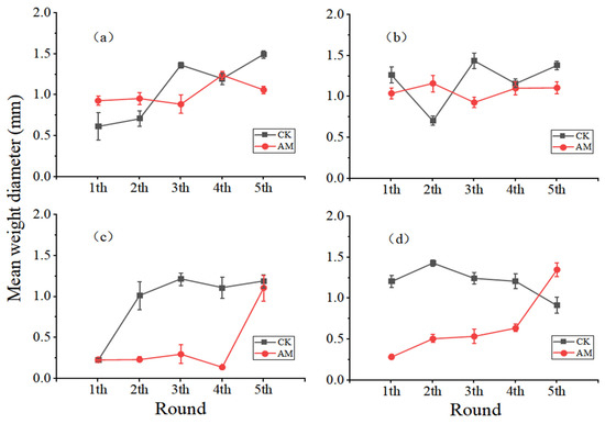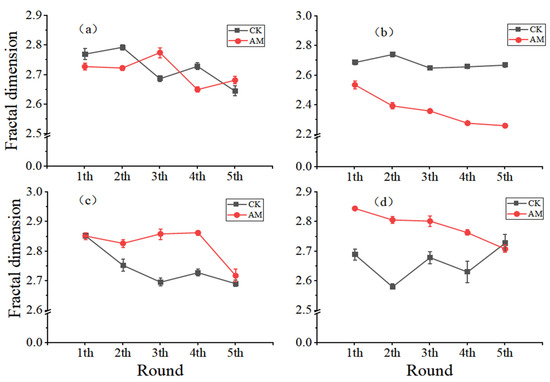 In this study, the percentage of sediment particle size in the four grass strips >2 mm was significantly higher under CK treatment than under AM treatment (p < 0.05; Figure 5). The sediment content percentage of Z. japonica and A. sinicus in the large particle size ranges of >2, 1–2, and 0.25–1 mm under the CK treatment was significantly higher than that in the AM treatment, whereas the sediment content in the small particle size ranges of 0.02–0.25, and <0.02 mm was significantly higher under AM treatment than under CK treatment. Studies have shown that AMF can regulate root morphological development [36]. The hyphae of AMF can provide a good rhizosphere environment for plants, and by enhancing nutrient absorption and improving photosynthetic efficiency, they can enhance the ability of the host plants to absorb nutrients, improve plant nutrient levels, improve plant stress resistance, and promote plant growth in nutrient-poor soil. The combination of AMF and plants can improve soil physicochemical properties and rhizosphere microbial communities [37] and has the potential to help plants adapt and transform the soil environment. By promoting the growth in plant roots, the anchoring effect on the soil was strengthened; therefore, the loss of larger-size sediments was reduced in the AM treatment compared with the CK treatment, especially in the particle size range of >2 mm. The mean weight diameter (MWD) showed an overall increasing trend with the increase of scouring time (Figure 6). The agglomerate degree of the lost sediment particles increased under continuous scouring, whereas the fractal dimension (D) decreased under continuous scouring (Figure 7). Because the rills developed faster under continuous scouring, the runoff convergence capacity in the rills was greater, the disintegration of soil particles was faster, and the content of larger particles of sediment was higher. The mean weight diameter (MWD) of sediments produced by the four grass strips under CK treatment was larger than that under AM treatment (Figure 6). Under CK treatment, the fractal dimension (D) of Z. japonica and A. sinicus under continuous scouring was smaller than that under AM treatment (Figure 7). The sediment particle size produced by continuous scouring under CK treatment was generally larger than that under AM treatment.