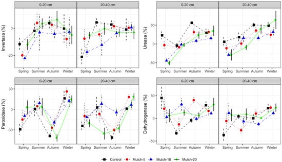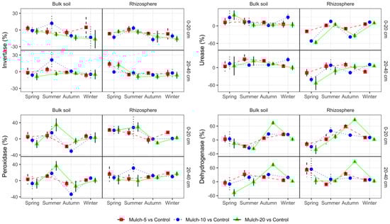 Generally, organic mulching had a greater effect on the enzymatic activities in the rhizosphere than those in the bulk soil. That is, in spring, the invertase activity in the topsoil (0–20 cm) rhizosphere under Mulch-10 was 14% lower than that in the control, whereas it was 14% higher in the subsoil (20–40 cm) rhizosphere under Mulch-5 (Figure 1). Moreover, peroxidase activity in the rhizosphere under Mulch-5 increased in spring and decreased in the bulk soil in autumn. Meanwhile, in autumn, dehydrogenase activity increased by up to 75%, whereas rhizosphere urease activity decreased by up to 35%. The effects of organic mulching on enzymatic activities generally increased with the mulching amount. However, organic mulching decreased the differences in enzymatic activity between the rhizosphere and bulk soil (Figure 2).
