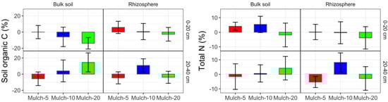 Mulching increased the dissolved C, MBN, and dissolved N in the bulk soil, as well as MBC in rhizosphere soil, while decreasing nitrate content in the bulk soil (Figure 3 and Figure S2, Table S3). Mulch-5 exhibited greater effects on MBN and bulk soil nitrate, whereas Mulch-10 did not affect dissolved C, dissolved N, ammonium, or MBC in the bulk soil. Dissolved C content increased by 1–13% after organic mulching, while the rhizosphere MBN increased under Mulch-5 by 22 and 27% in the topsoil and subsoil, respectively. In general, the SOC, TN, dissolved N, nitrate, and MBN contents in the rhizosphere soil were higher than those in the bulk soil, whereas that of ammonium and MBC exhibited the opposite trend (Figure 4 and Figure S2).