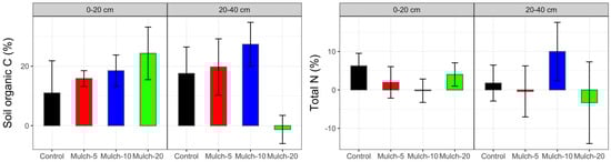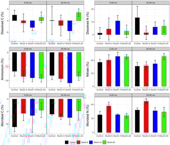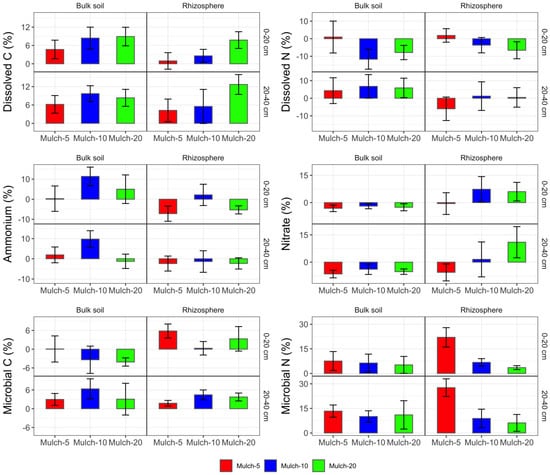 Differences in the C and N fractions between mulching treatments and the control in the rhizosphere and bulk soil. Values represent mean ± standard error (n = 5). Values above the 0 line indicate C and N content higher in the rhizosphere than in the bulk soil.