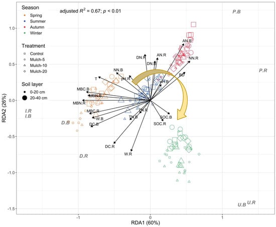 Redundancy analysis (RDA) ordination plot of enzyme activities constrained by environmental variables that significantly explain the variation. I: invertase; U: urease; P: peroxidase; D: dehydrogenase; T: temperature; W: water content; BD: bulk density; SOC: soil organic C; TN: total N; DC: dissolved C; DN: dissolved N; AN: ammonium; NN: nitrate; MBC: microbial C; MBN: microbial N. “B” means “in bulk soil” and “R” means “in rhizosphere”. The RDA was performed based on original data (Figures S1 and S2). The curved arrow indicates the development of enzyme activities over the year.
