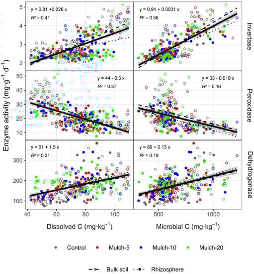 Dehydrogenase partially reflects the overall microbial enzyme activity in soil. Mulching increased the dehydrogenase activity in both the rhizosphere and bulk soil in autumn, thus accounting for the increased mineralization of organic substances from both plant root and litter decomposition in autumn. An additional N source provides sufficient N for soil microbes, thus alleviating N competition between microorganisms and plants [,] and increasing microbial activity [,]. As shown in the current study, dehydrogenase activity increased with dissolved C and MBC (Figure 6).