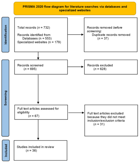 The initial search returned a total of 732 records of which 553 were articles from the databases and 179 from the specialized websites. Next, 37 duplicates were removed from the initial search, leaving a total of 695 records for screening. After screening, 628 records were excluded for failing to meet the eligibility criteria, hence the remaining 67 articles were downloaded and full text read for eligibility. A total of 31 from the 50 downloaded articles did not meet the inclusion/exclusion criteria and were excluded. In the end, 36 articles (Appendix A) were eligible and used for this systematic review. Figure 1 gives a summary of the systematic review process.