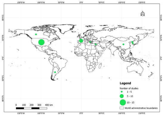 There were variations in the geographical distribution of the relevant studies (Figure 2). Nearly half of the studies (14) were from North America (United States of America n = 13, Canada n = 1), 8 from Europe (Southern Europe n = 7, Greece n = 1), 3 from Asia (South and North Korea n = 1, South Korea n = 1, China n = 1), 1 from South America (Argentina), 1 from the tropical humid regions, 1 from the Middle East (Lebanon), and 8 were general papers without geographical association.