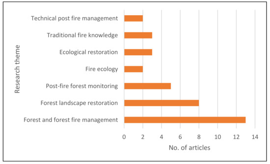 In terms of the literature sources, 12 articles were sourced from Web of Science, 10 from Google Scholar, 7 of the articles we sourced from Scopus, 5 from CAB direct, and 2 from specialized websites (IUCN and FS-USDA). Peer-reviewed journal articles formed most of the final articles. More than half (24) of the selected literature were review articles, 4 research articles, 5 book chapters, and 3 reports. The research themes and focus area of the selected studies (Figure 3) revolved around forest and forest fire management [11,17,61,79,80,81,82,83,84,85,86,87,88], fire ecology [89,90,91], forest and landscape restoration [25,49,53,59,92,93,94], post-fire forest monitoring [26,95,96,97,98], ecological restoration [99,100,101], technical post-fire management [102,103], and traditional fire knowledge [46,103,104].