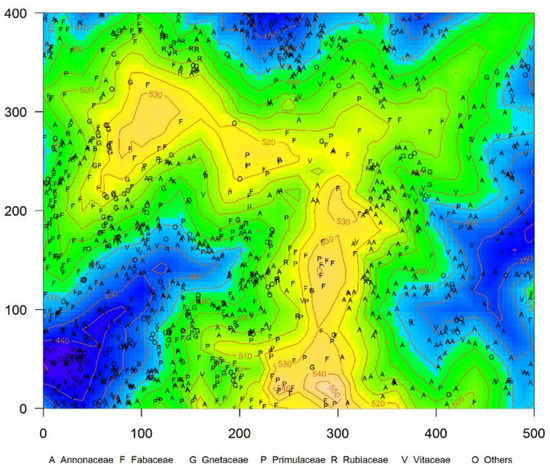 The distribution of liana individuals in a 20 ha subtropical forest dynamic plot in Chebaling (CBL), China. Color and numbers on the contour lines denote elevation. Capital letters show the locations of lianas and indicate their families.