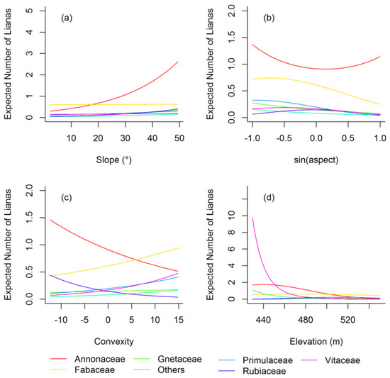All families except Vitaceae and Others had negative coefficients for the quadratic term of elevation and their inflection points were within the range of elevation for the plot, showing convex curves for the expected number of lianas with respect to elevation (Figure 2d). In most cases, the curves were mild. The inflection point for Annonaceae was close to the lower limit, resulting in a decreasing trend for the main range of elevation (Figure 2d). Vitaceae and Others showed decreasing number of lianas with increasing elevation (Figure 2d).