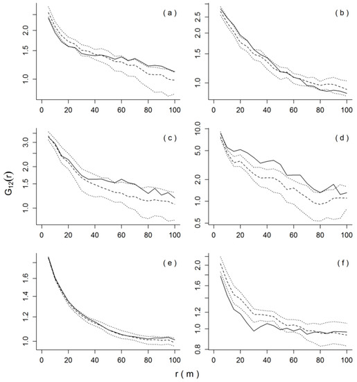 Though in general, the majority (144/246, 58.5%) of liana–tree associations were positive, the G12(r) curves usually did not deviate from the upper confidence envelopes much (Figure 3). Among these associations, a considerable proportion (61/144) of G12(r) curves deviated from random toroidal shift at fewer than five scales examined (Figure 3c,e). This proportion was even larger for negative associations. Almost all (49/53, 92.5%) G12(r) curves for negative associations deviated from random toroidal shift at more than five scales examined. The four exceptions were Ilex dasyphylla, Elaeocarpus chinensis, Machilus grijsii with Fisold, and M. grijsii with Ampcan (Figure 3f as an example).